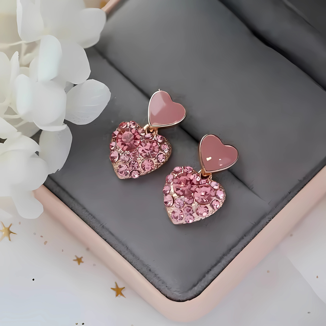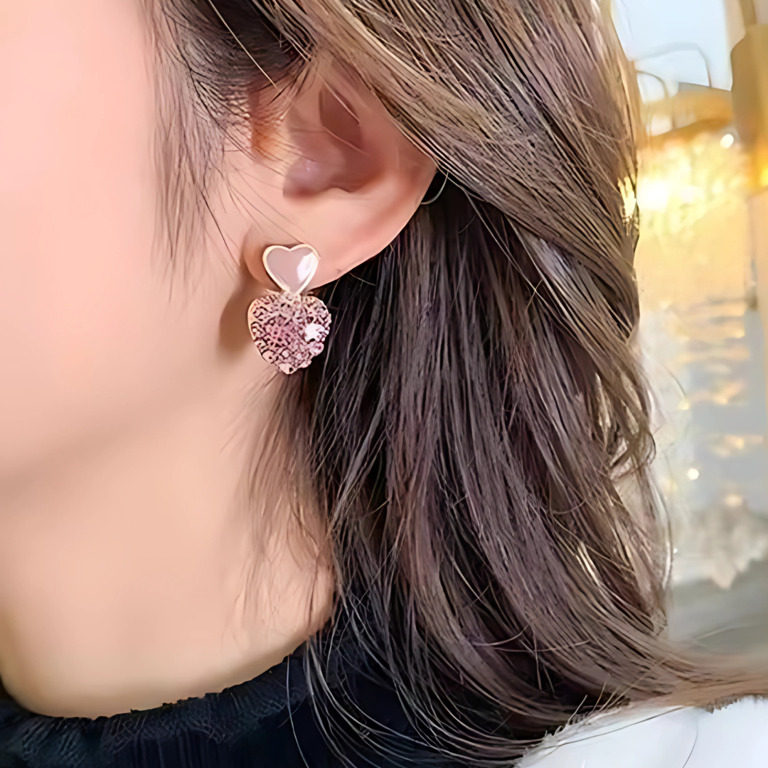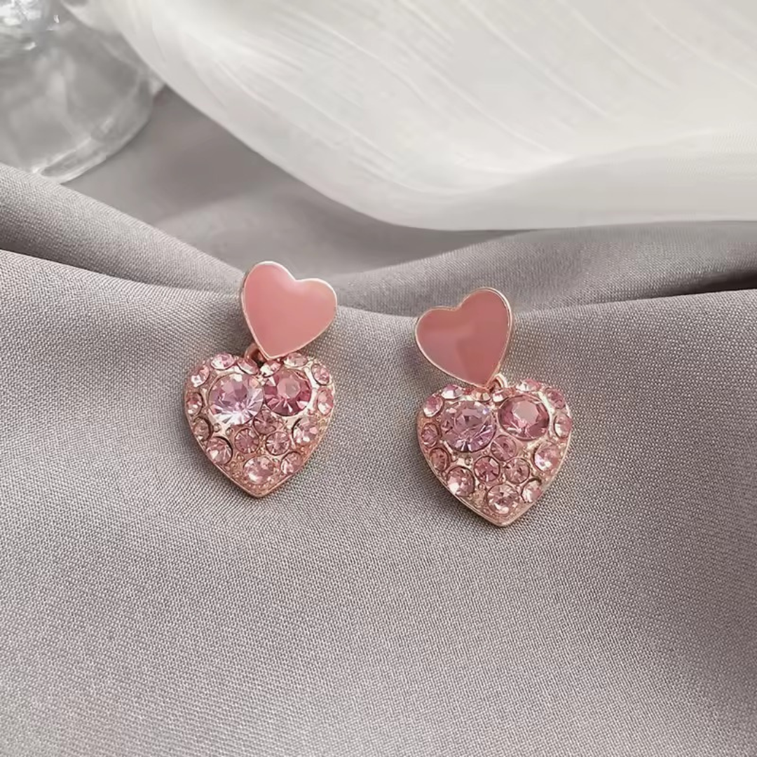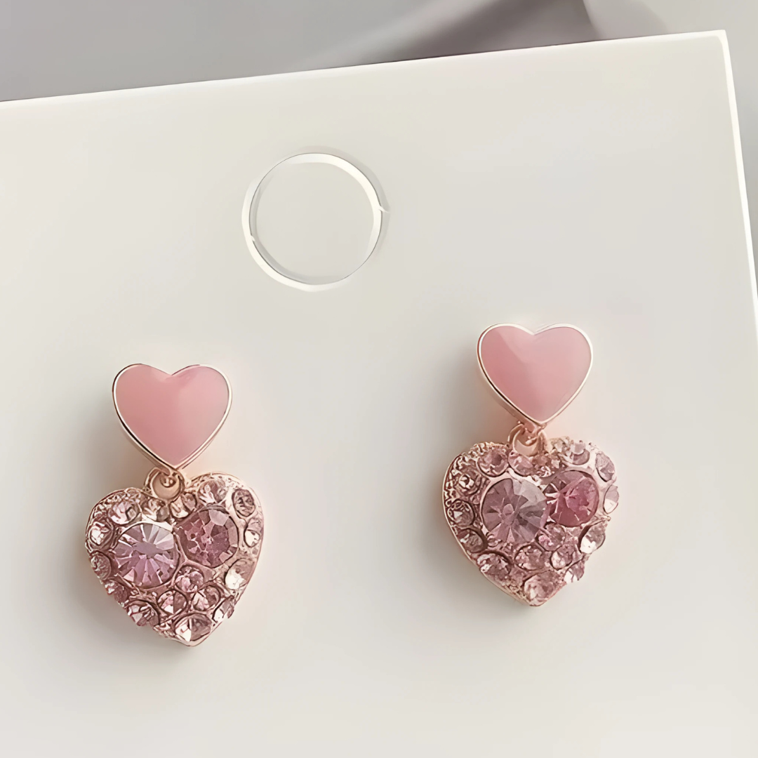 Deze charmante roze hartvormige oorbellen geven elke outfit een romantische en speelse glans. Ze zijn ontworpen met een glanzend emaille hartje aan de bovenkant en een met glitter gevuld hartje aan de onderkant, en voegen een vleugje zoetheid en glans toe, perfect voor casual dagen of speciale gelegenheden.