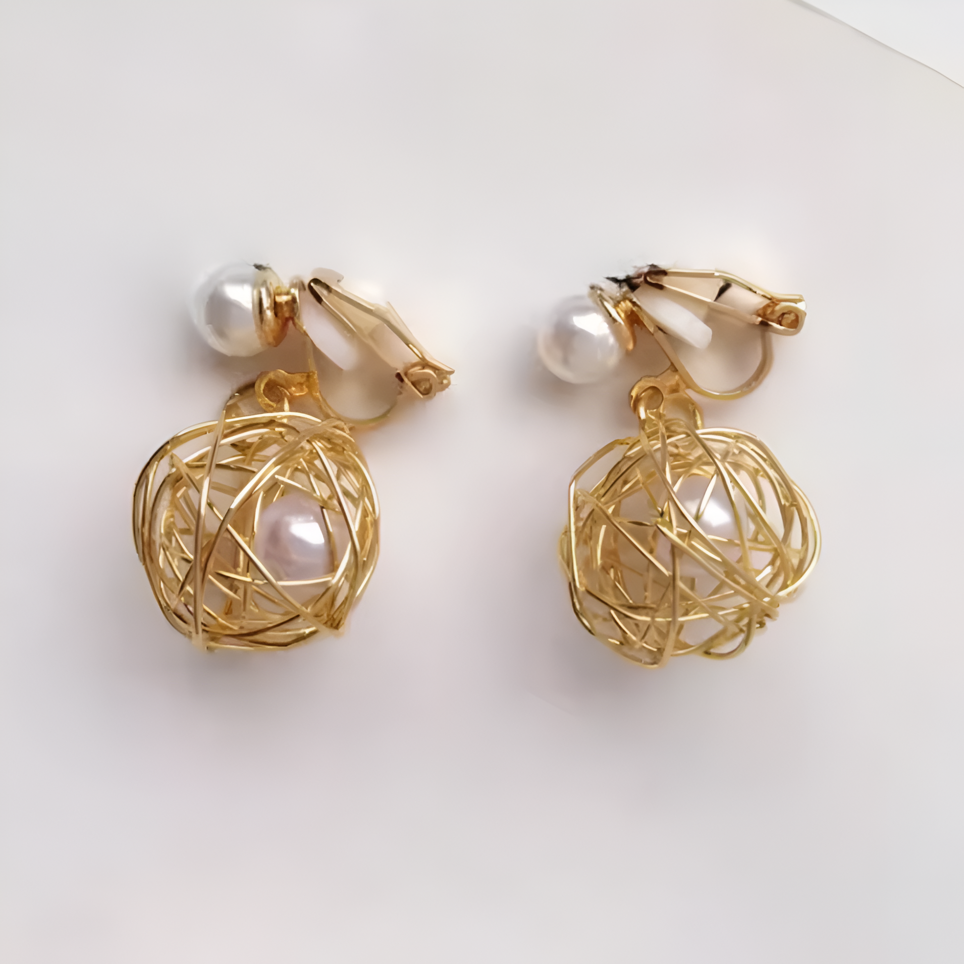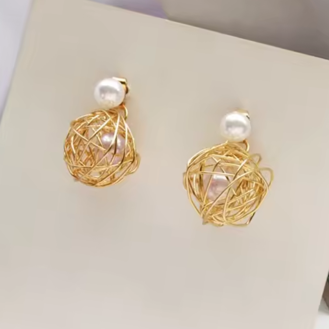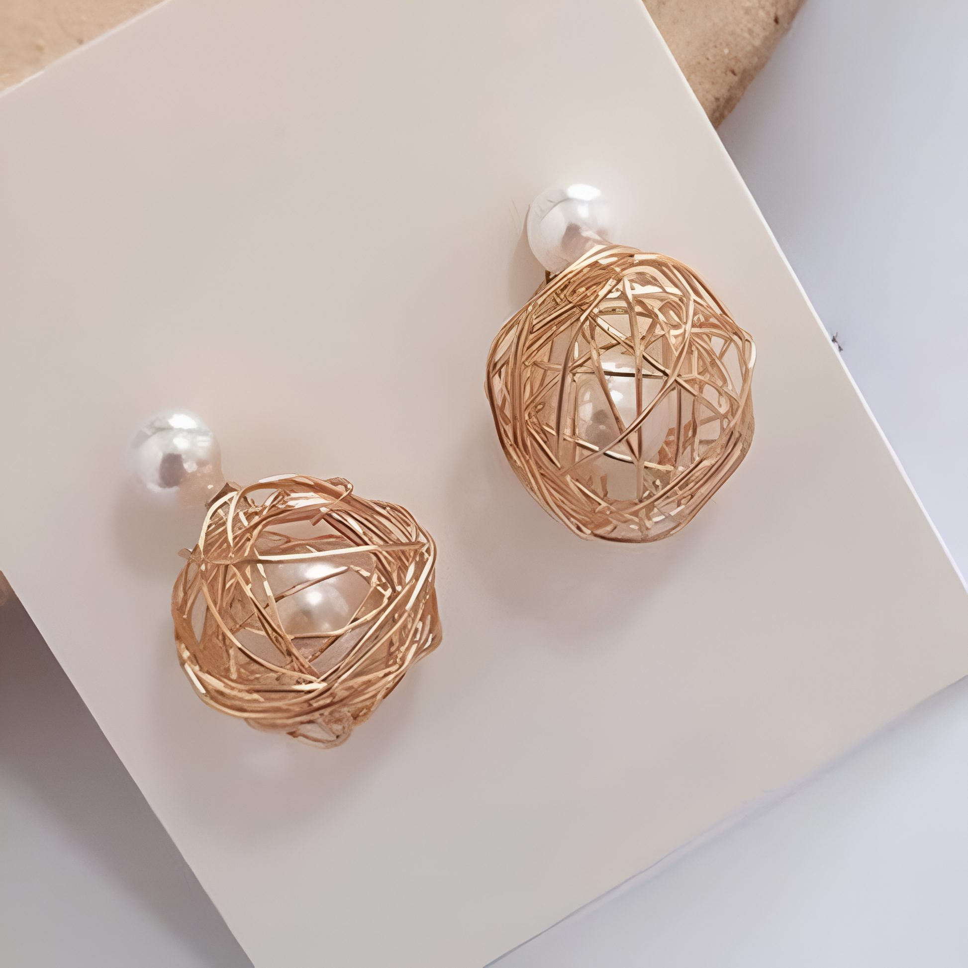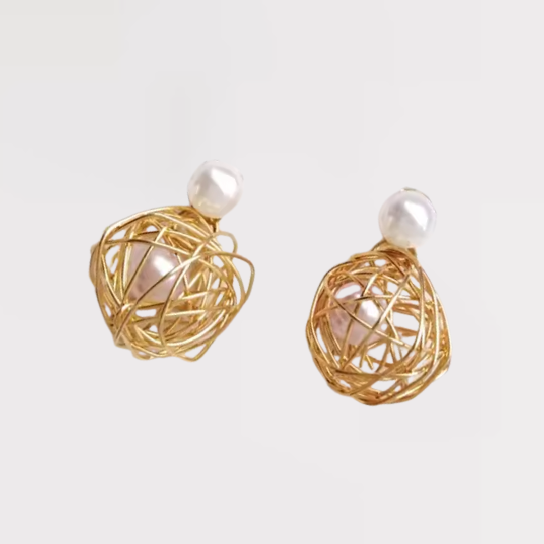 Deze artistieke oorbellen hebben een modern draadkooidesign in goudkleur, met in het midden een glanzende parel. De combinatie van gestructureerd metaal en gladde parel zorgt voor een verfijnd contrast, waardoor ze een opvallend accessoire zijn voor elegante of eigentijdse outfits.